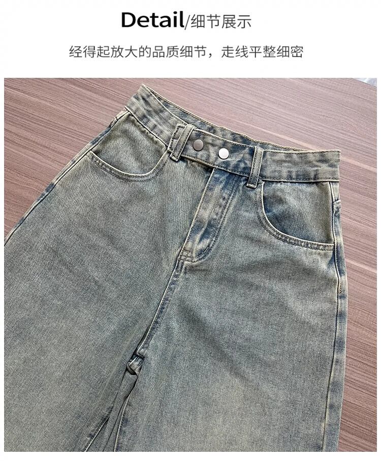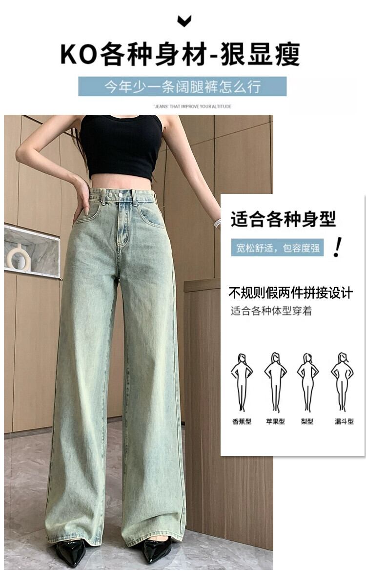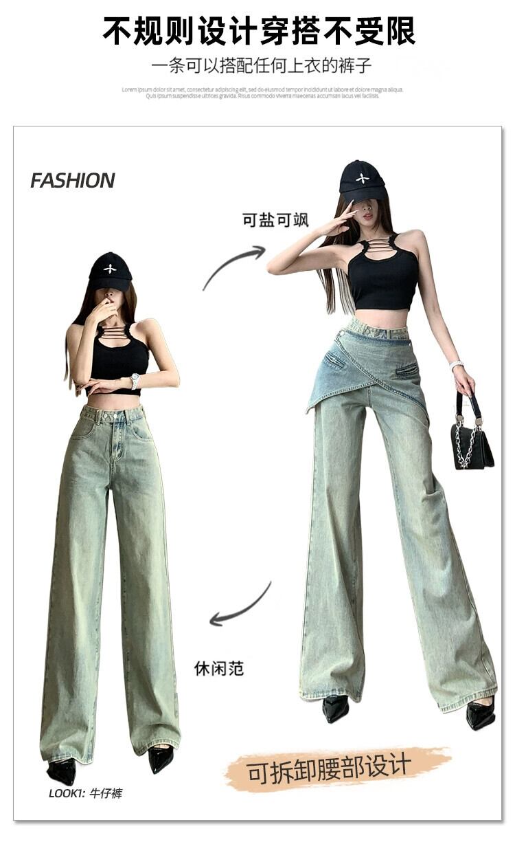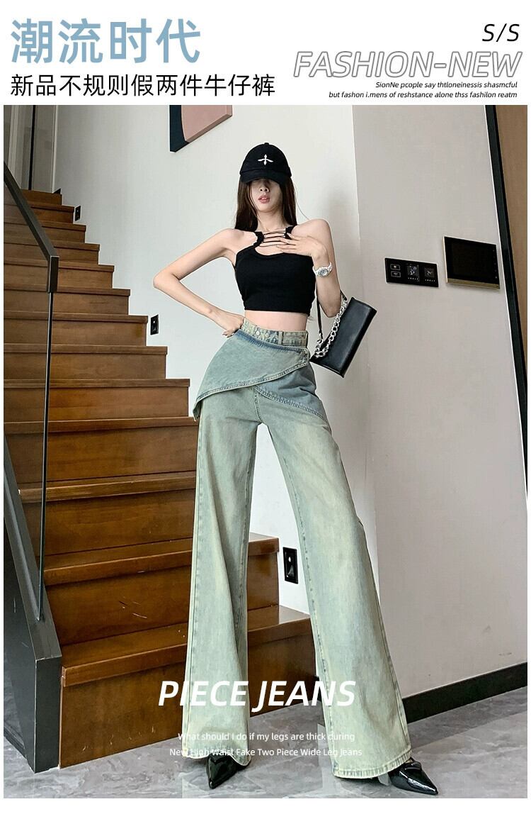 アメリカンスタイルのニッチな新しい不規則な偽ツーピースデザインレトロダメージストレートジーンズワイドレッグパンツ女性トレンディな ワイドパンツ nana14678147348 | modepoisson