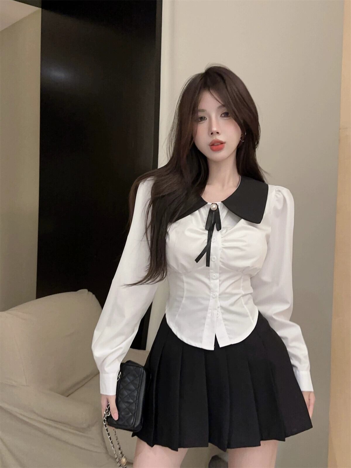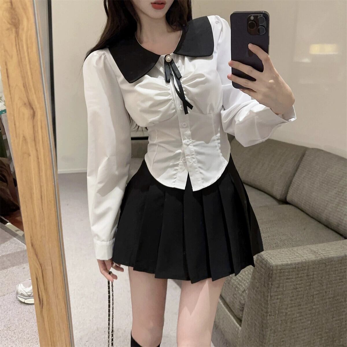 スリムスリム長袖シャツ女性の秋と冬のフランスの新しいデザインニッチトップショートドールカラーシャツ ロング オータム 秋物 ウィンター 冬物 nana56275550395 | modepoisson