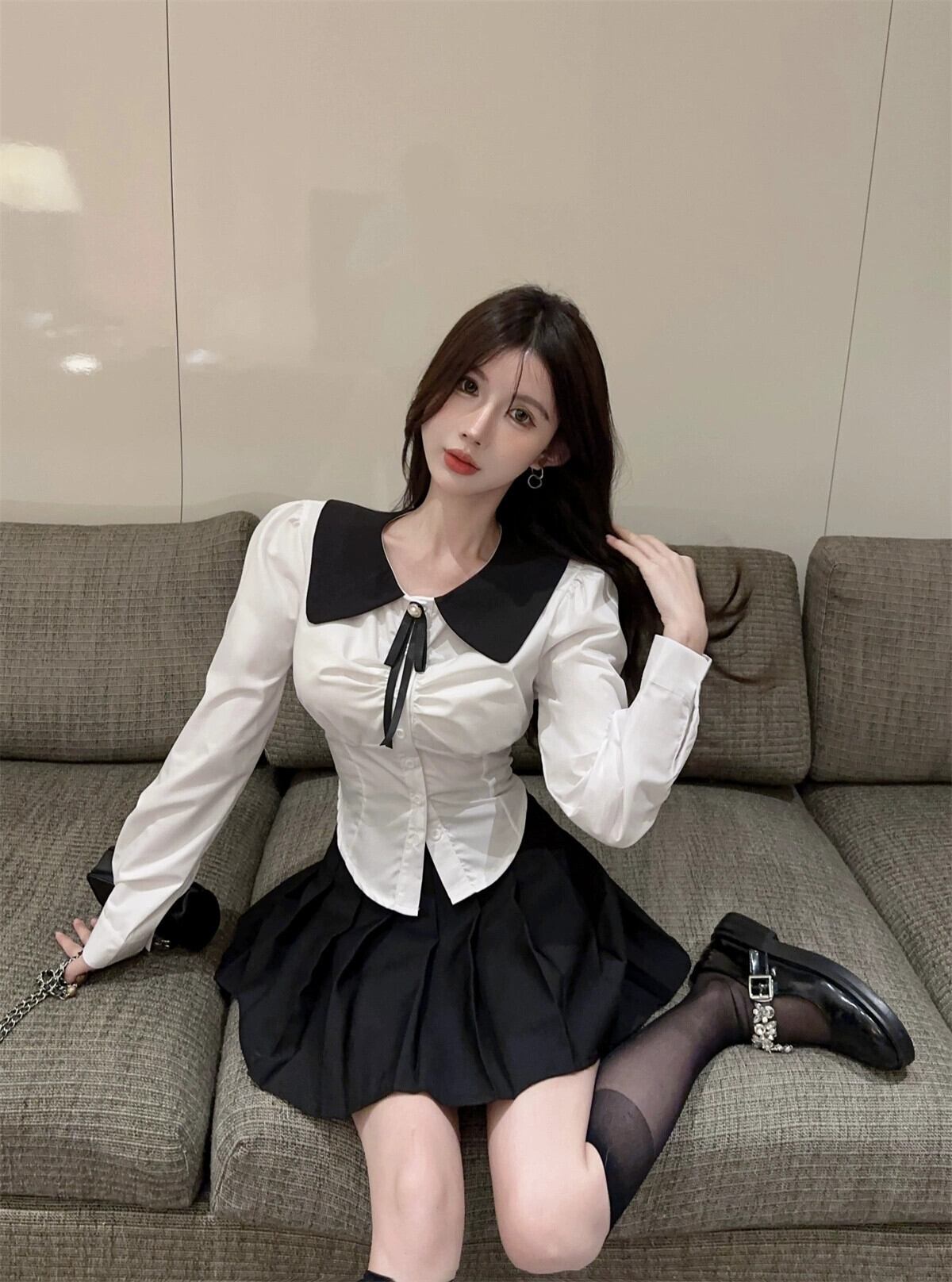 色:長袖シャツにはネクタイが付属します,ブラックプリーツスカート