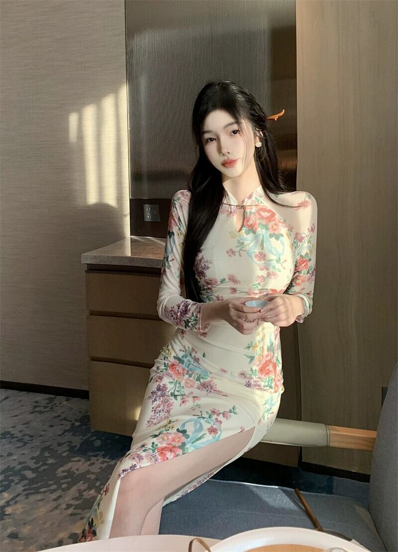 プリントチャイナドレス女性の秋と冬の新しい中国風中国風のインナーヒップスカートスリムスリムミドル丈スカート オータム 秋物 ウィンター 冬物 nana70138145742 | modepoisson