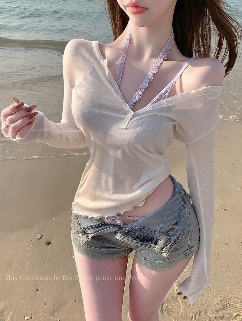純粋な欲望のセクシーなニッチ白 tシャツ女性の春の新スタイルのインナースリムフィットボトリングシャツ気質長袖トップ ロング ホワイト スプリング 春物 nana919764745 | modepoisson