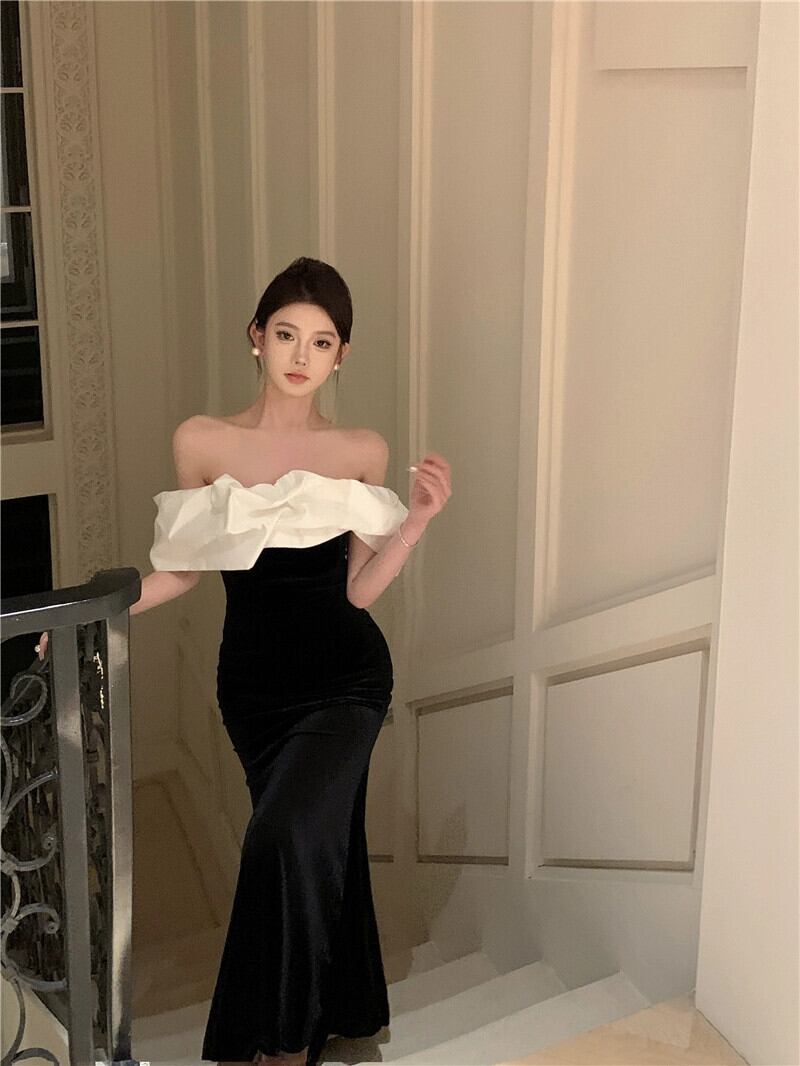 ゴールドベルベットのワンショルダーインナードレス女性の秋と冬の新しいフレンチスリミングドレスフィッシュテールロングスカート オータム 秋物 ウィンター 冬物 nana65265745732 | modepoisson