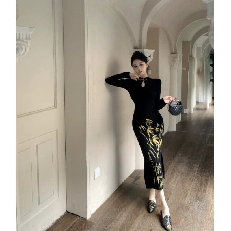 レトロな新中国風の長袖チャイナドレス女性の秋と冬スリムフィットインナーミッドレングスウエストカバーヒップスカート ロング オータム 秋物 ウィンター 冬物 nana98442642103 | modepoisson