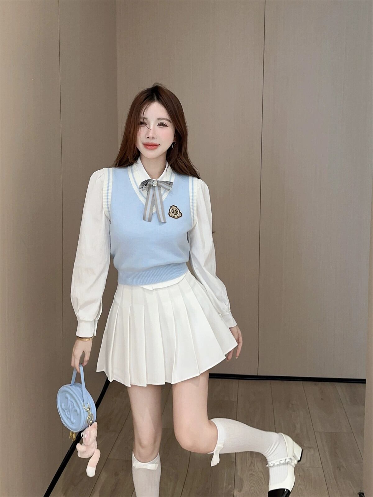 今年人気のスリーピースシャツ、カレッジ風ベスト、ハイウエストプリーツスカート、スカート、秋冬プチスーツレディース オータム 秋物 ウィンター 冬物 nana71365465331 | modepoisson