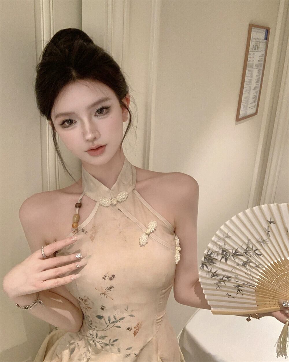 レトロな新中国風のノースリーブホルタードレス女性の夏の新しいスタイルウエスト気質改善されたチャイナ A ラインショートスカート サマー 夏物 Aライン nana53414743368 | modepoisson