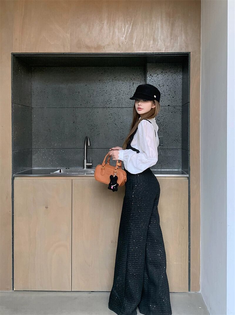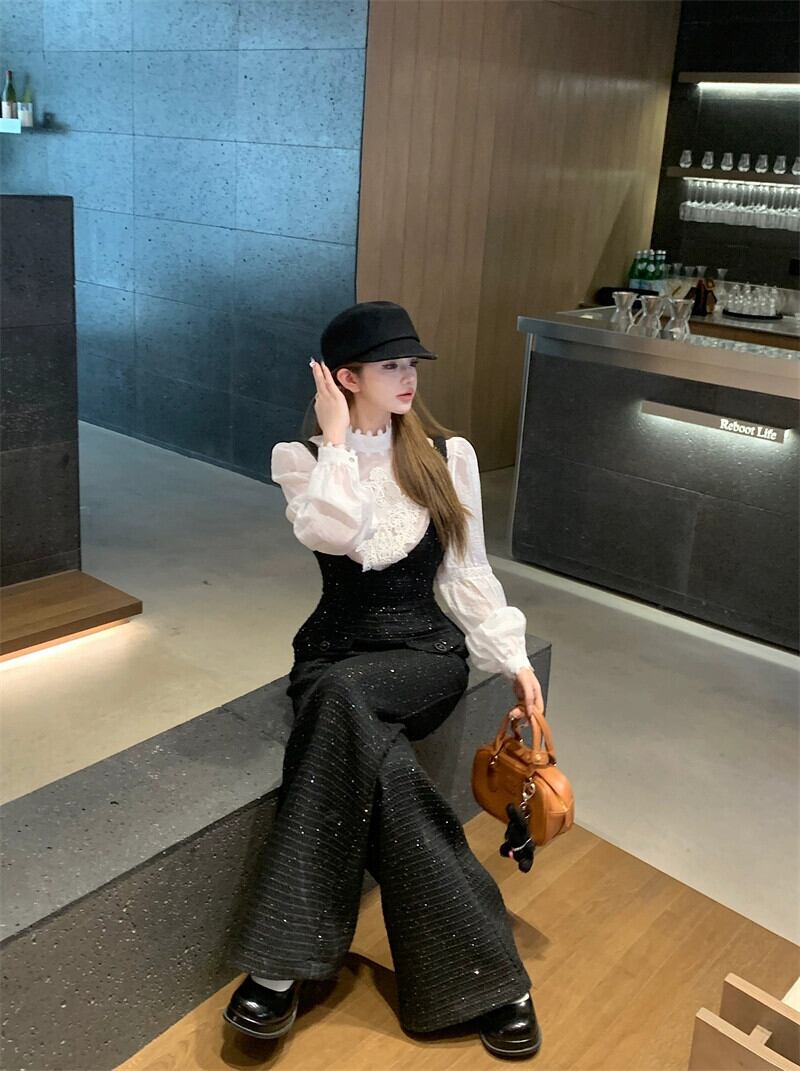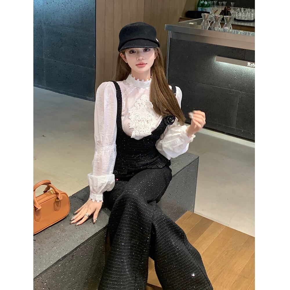 フレアオーバーオールデザインカジュアルパンツ新しい甘いクールなスタイルのズボンの女性の秋と冬のファッションジャンプスーツワイドレッグパンツ レッド 大人ガーリー スウィート キュート オータム 秋物 ウィンター 冬物 ワイドパンツ nana87857195793 | modepoisson