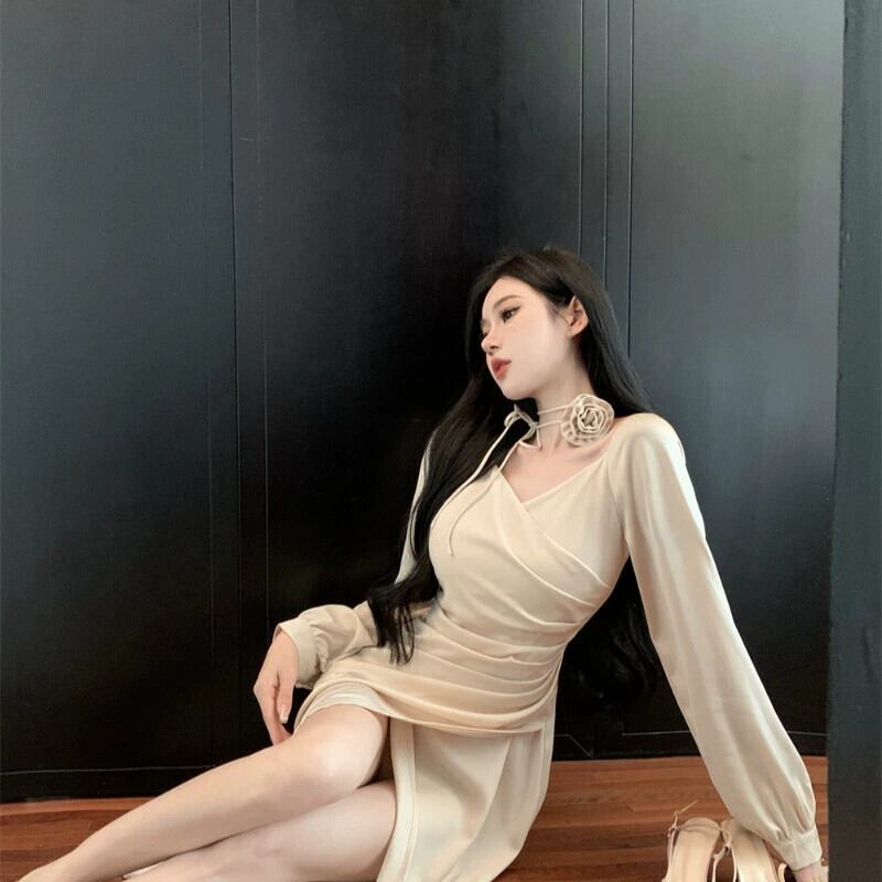 フレンチスタイル V ネック長袖ドレス女性の秋と冬のハイウエストデザイン痩身スカートスリットミモレ丈スカート ロング オータム 秋物 ウィンター 冬物 Vネック nana76087801290 | modepoisson