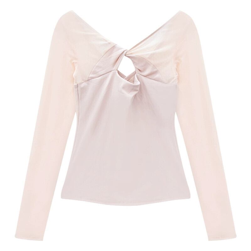 純粋なセクシーな V ネック中空長袖 Tシャツ女性の秋と冬のメッシュスプライシングデザインニッチスリム新しいトップ ロング オータム 秋物 ウィンター 冬物 Vネック nana95611849717 | modepoisson