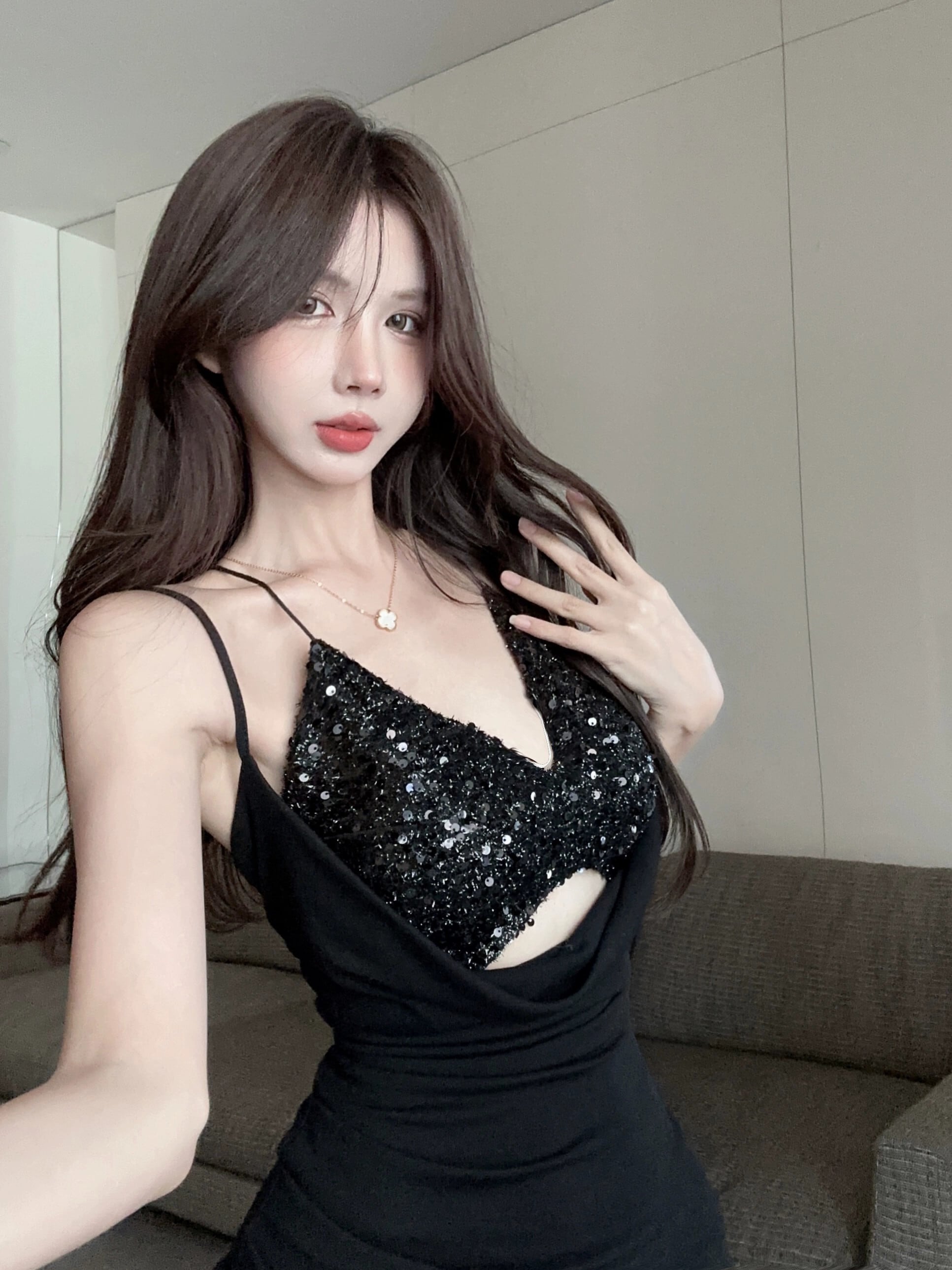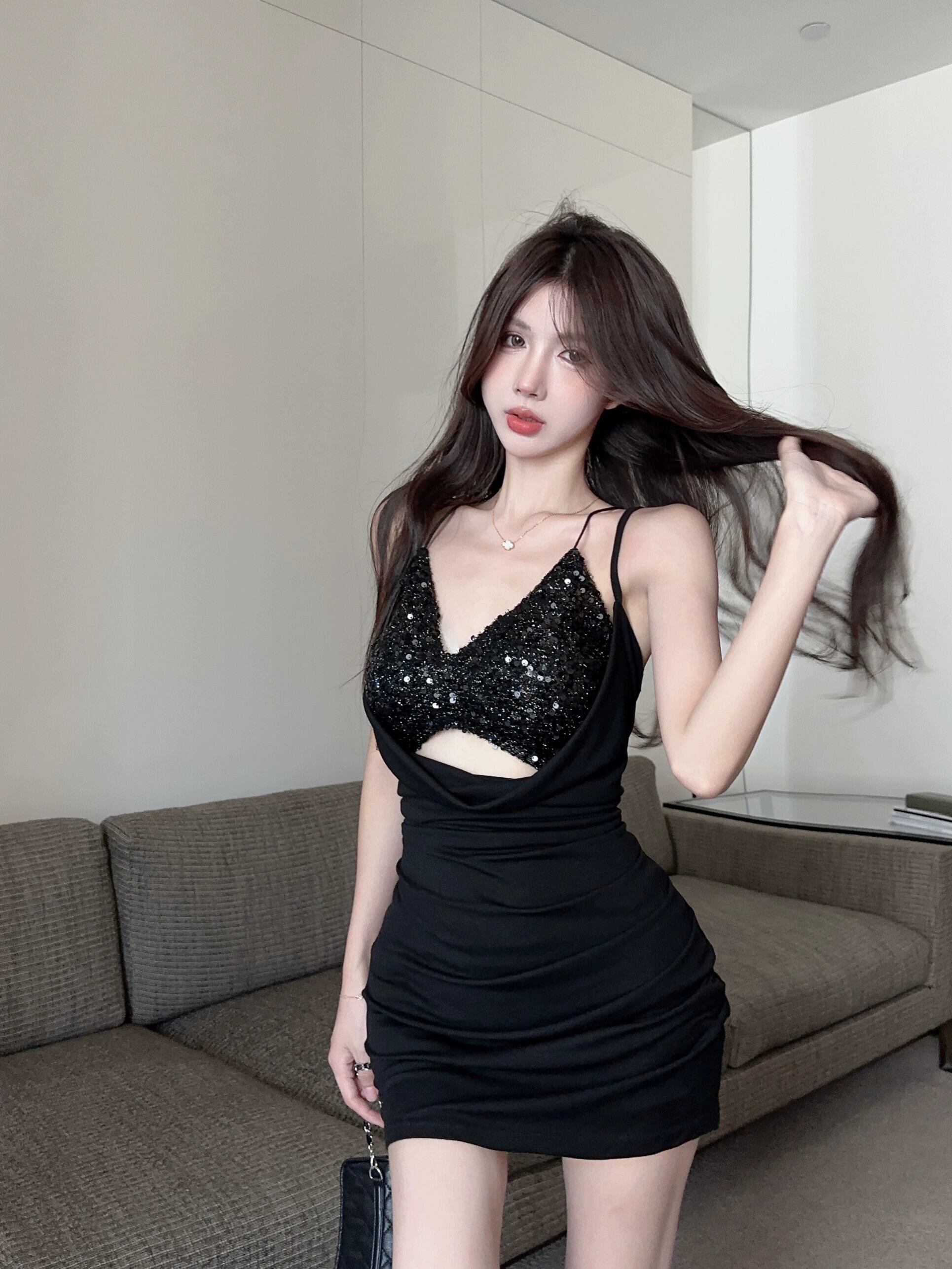 -エンドスパンコール付きスリムフィットホルターネックサスペンダードレス秋と冬、セクシーな黒のショートスカート2点セット女性 ブラック オータム 秋物 ウィンター 冬物 nana66089009766 | modepoisson