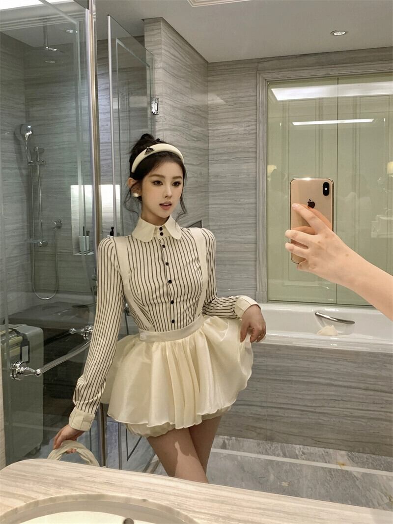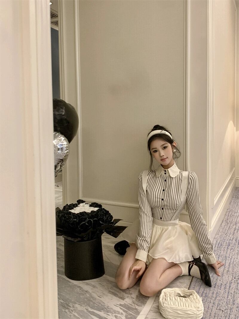 色:光沢のあるオフホワイトのキュロット,ネイビーブルーのコントラストのあるライスシャツ