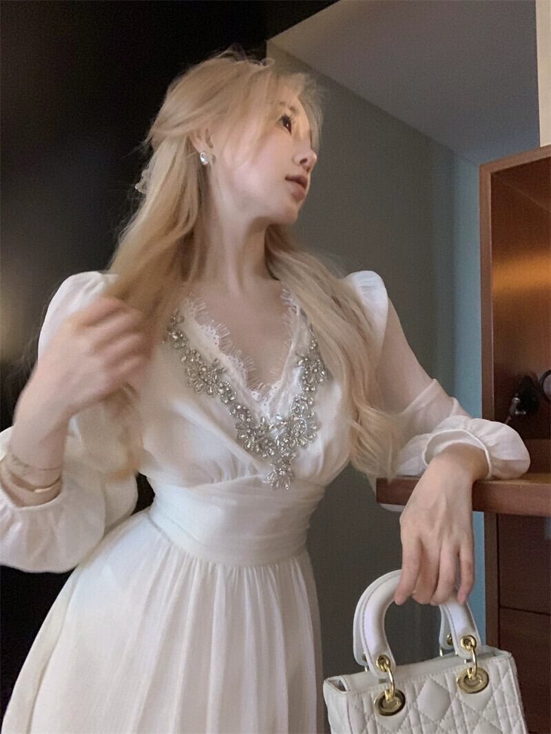 ニッチレースドレス、気質とドレープスカート、ウエストスリムVネックレディース秋冬新作フレンチスリムロングスカート オータム 秋物 ウィンター 冬物 nana71696327603 | modepoisson