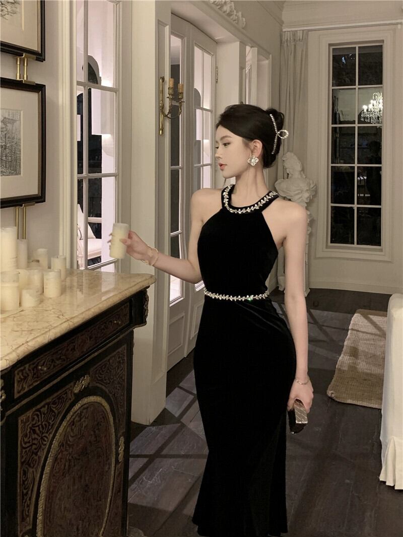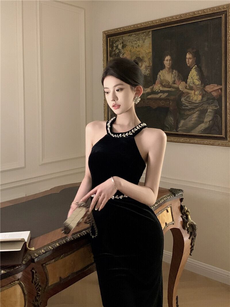 黒のベルベットのドレスの女性の秋と冬のセクシーなホルターネックサスペンダードレススカート新しいスリム気質ロングスカート ブラック オータム 秋物 ウィンター 冬物 nana3247450421 | modepoisson