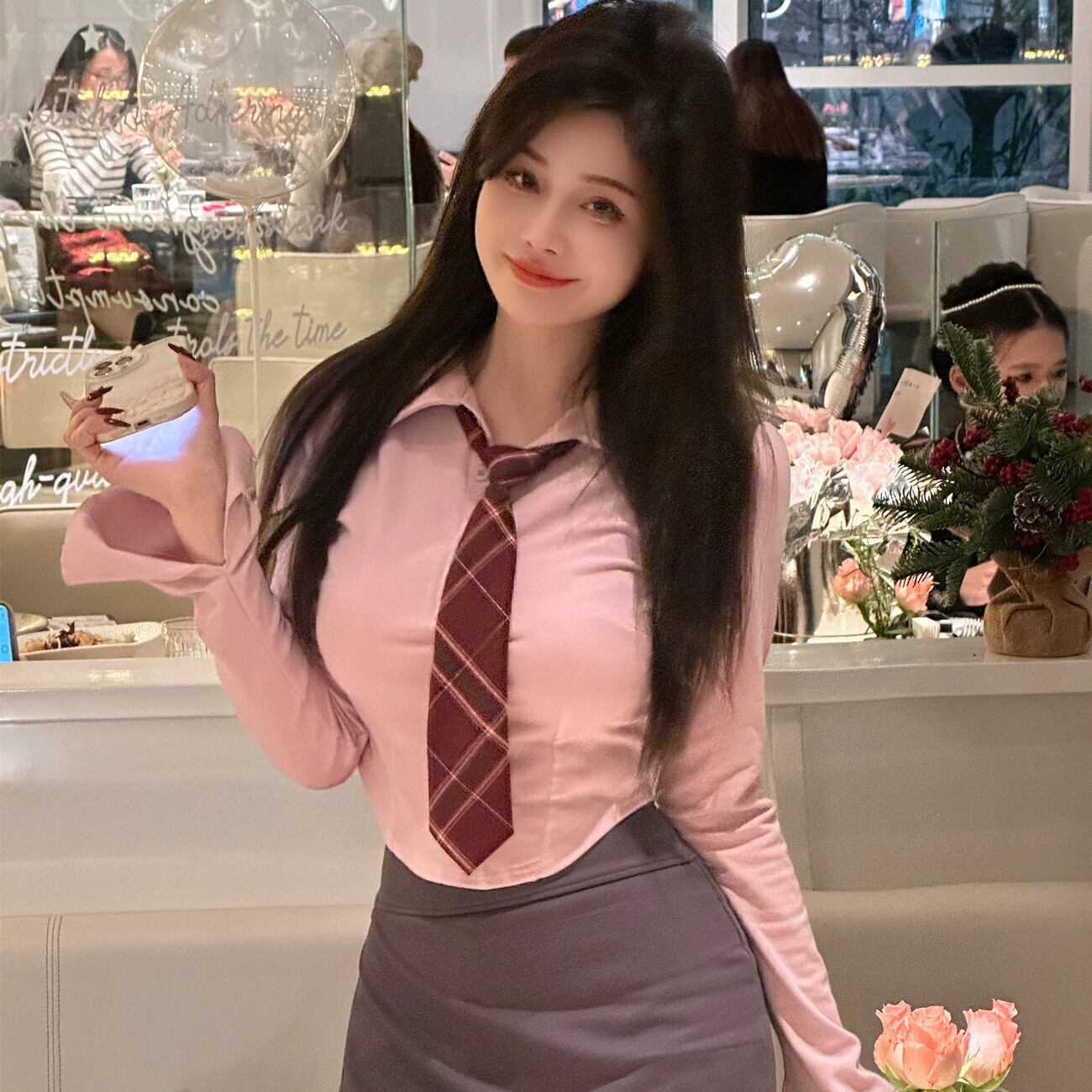 色:白のトップス+黒のネクタイ,白のトップス+チェック柄のネクタイ,濃い灰色の袴,黒ha,ピンクのトップス+赤いチェック柄のネクタイ