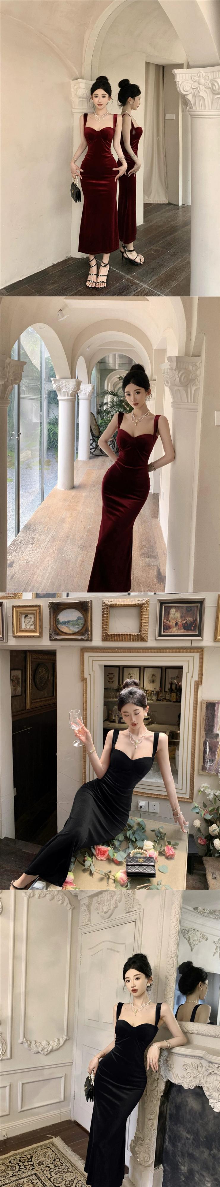 ベルベットサスペンダードレスレッド女性の秋と冬のインナーウェアセクシーなスリム気質ロングフィッシュテールヒップスカート オータム 秋物 ウィンター 冬物 nana33499578059 | modepoisson