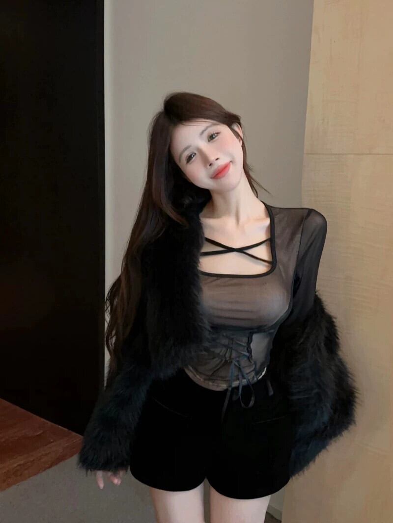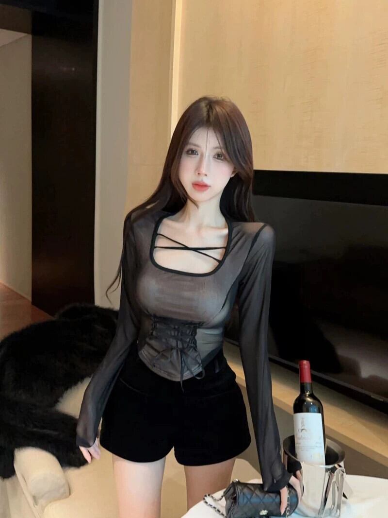 ホットメッシュシースルーセクシーな長袖 tシャツショートトップスリムフィットスクエアカラーボトムシャツ女性の秋と冬の新スタイル ロング オータム 秋物 ウィンター 冬物 スクウェア nana76243759429 | modepoisson