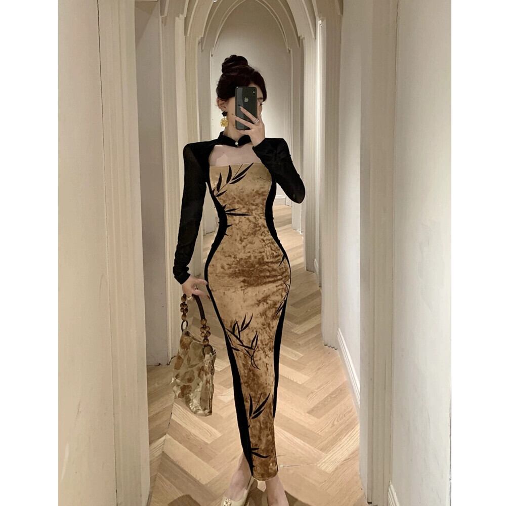 フランスのスリムフィットドレスの女性の秋と冬の新しい底付け長袖メッシュスプライシングベルベットプリントヒップスカート ロング オータム 秋物 ウィンター 冬物 nana45637651784 | modepoisson