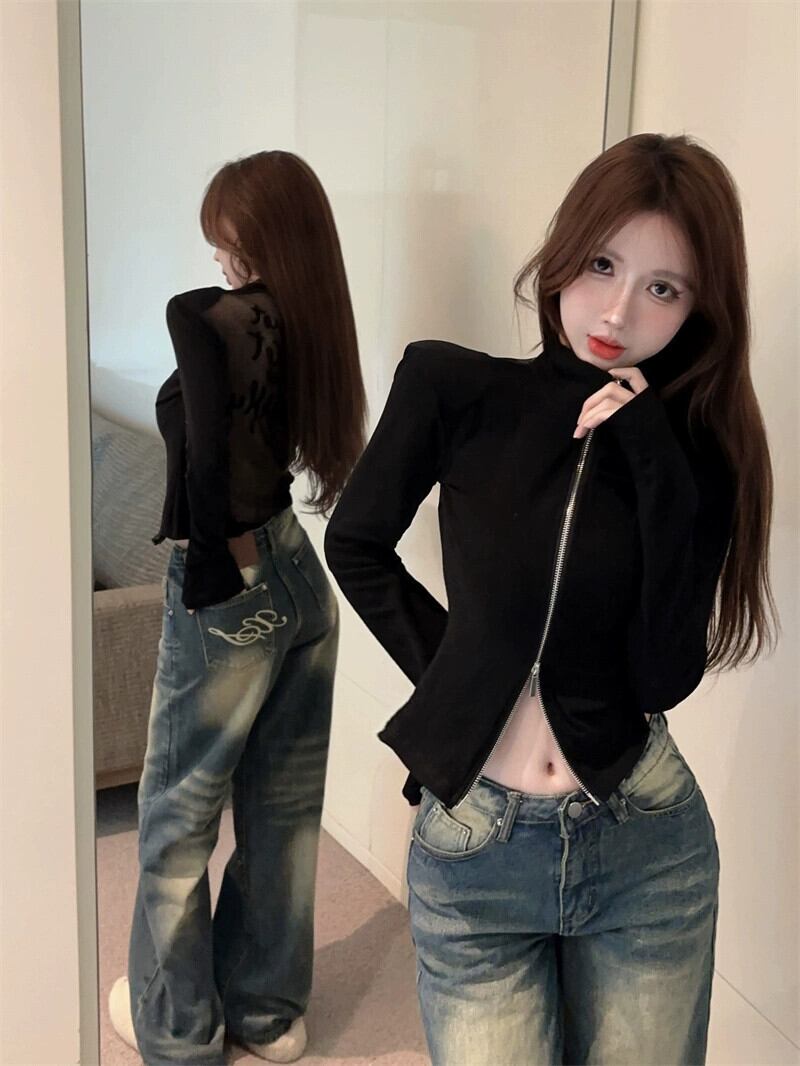 甘いバックメッシュ長袖 Tシャツの女性の秋冬シースルー厚手の文字プリントスリムショートカーディガントップ ロング 大人ガーリー スウィート キュート カジュアル オータム 秋物 ウィンター 冬物 nana26377611889 | modepoisson