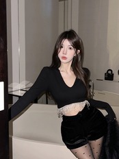 重工業チェーンテル V ネック長袖 Tシャツ女性のテーラードデザインニッチショートトップ秋と冬のボトリングシャツ ロング レッド オータム 秋物 ウィンター 冬物 Vネック nana17696129362 | modepoisson