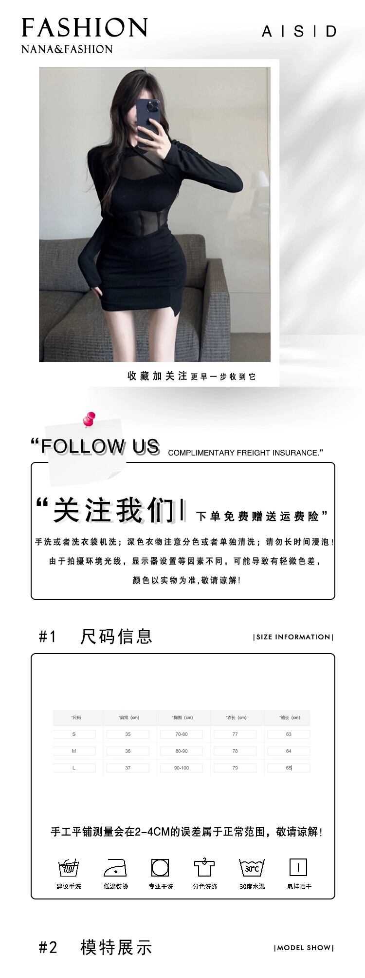 純粋な欲望セクシーなネクタイメッシュ長袖ドレス秋と冬スリムヒップハグデザインセクシーな女性のスプライシング黒ショートスカート ロング ブラック オータム 秋物 ウィンター 冬物 nana82075096124 | modepoisson