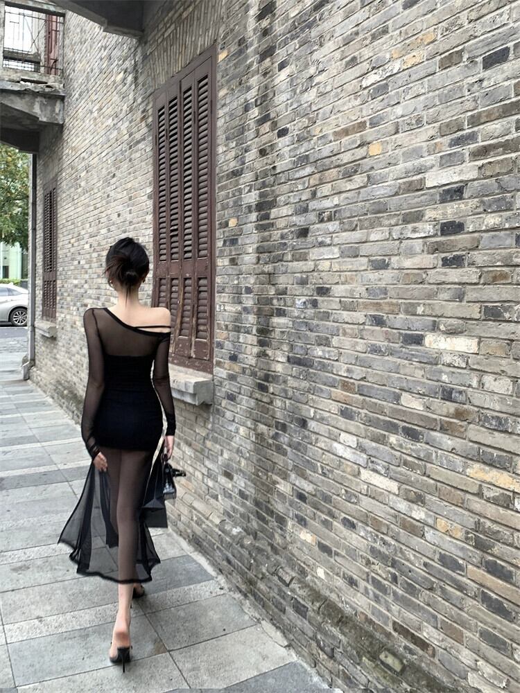 Sweet の高級メッシュ長袖ドレス女性秋冬ミッドレングス、スリムフィットショートヒップスカート ロング 大人ガーリー スウィート キュート カジュアル オータム 秋物 ウィンター 冬物 nana2026808679 | modepoisson