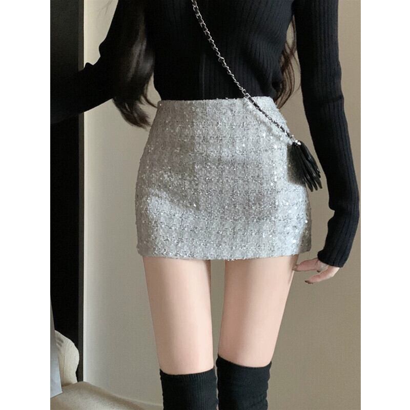 -エンドと超見栄えの良いスカートの女性、ハイウエストのスリムスカート、小さな香りの良いスパンコールが付いたヒップを包み込む秋冬のAラインスカート オータム 秋物 ウィンター 冬物 nana65918586260 | modepoisson