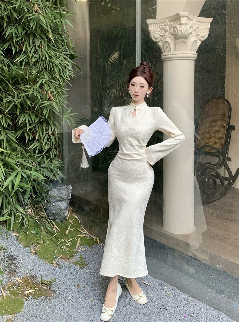 改良されたチャイナドレス女性、春の新作黒フレンチ長袖スカート、ウエストを締めるフィッシュテールヒップハグロングスカート ブラック スプリング 春物 nana53372460489 | modepoisson