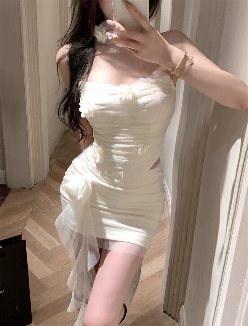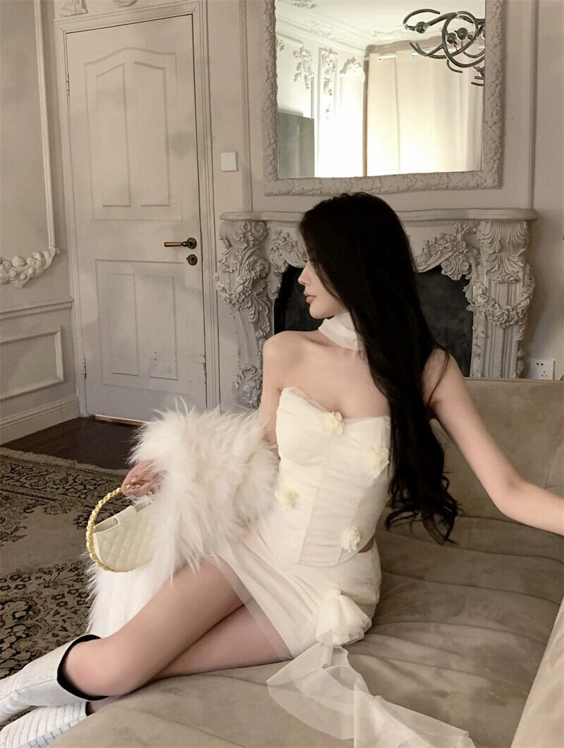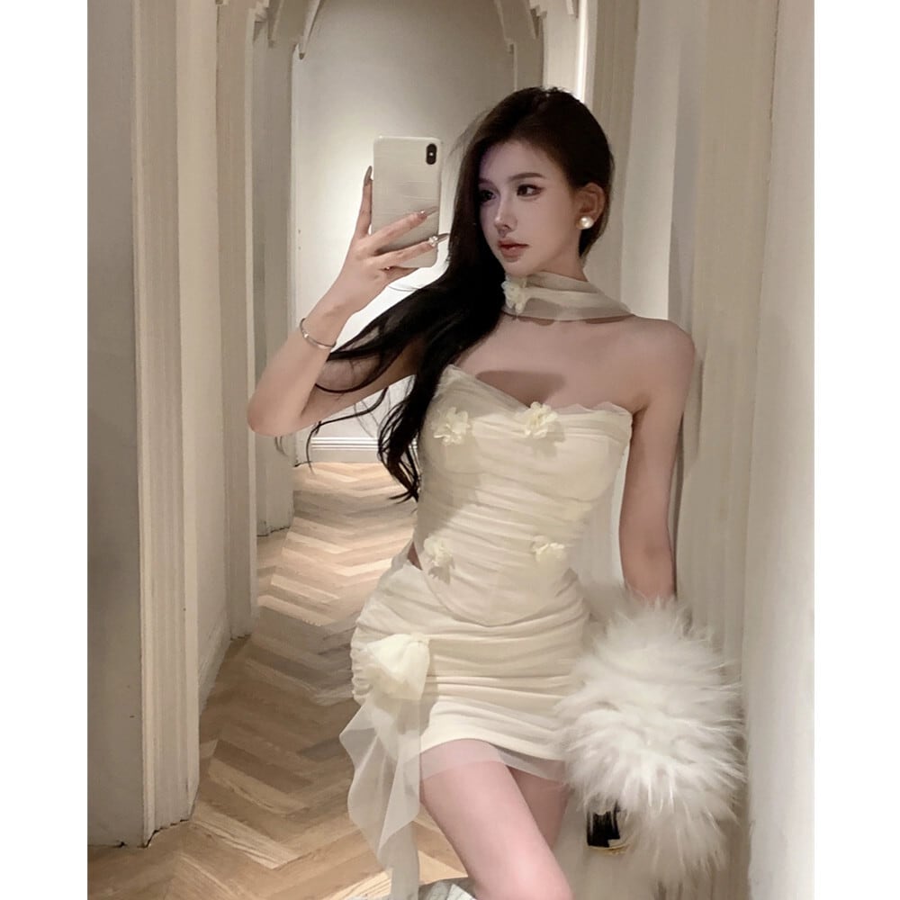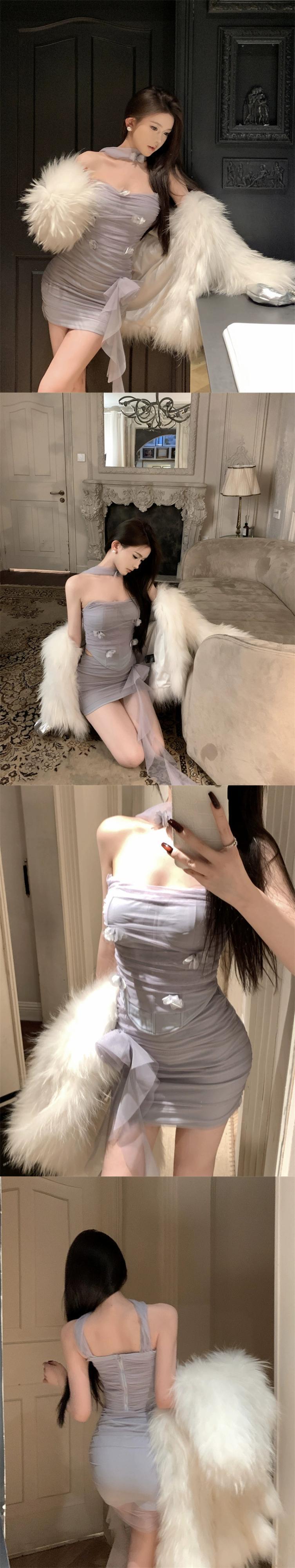 フレンチスタイルスーツメッシュスプライシングホルターネックチューブトップトップヒップカバーハーフスカート夏のツーピースセット女性 サマー 夏物 nana93979618387 | modepoisson