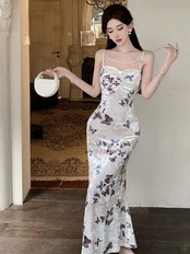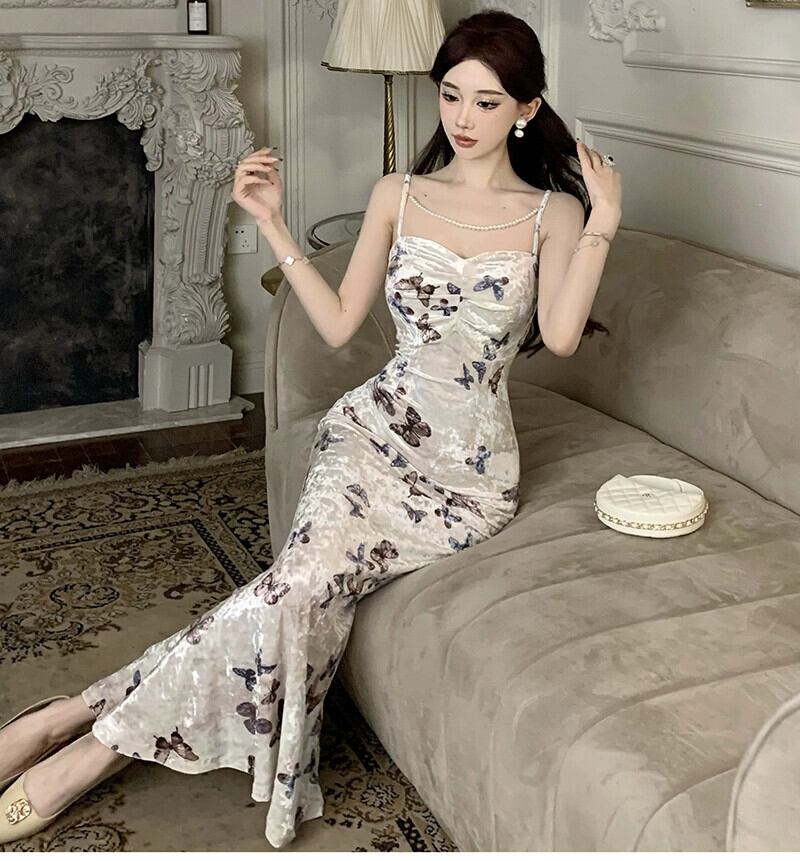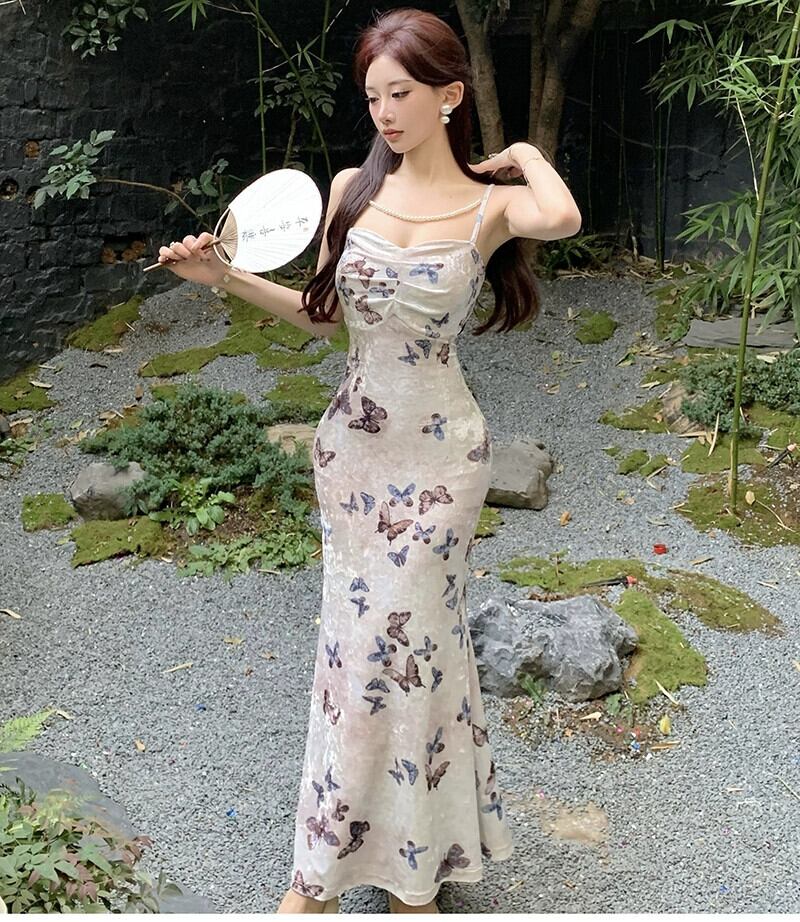 ナナ〜フレンチプリントスクエアネックサスペンダードレス女性の夏の新しいスタイル優しいスタイルの女性のウエストロングスカート サマー 夏物 スクウェア nana83164066736 | modepoisson