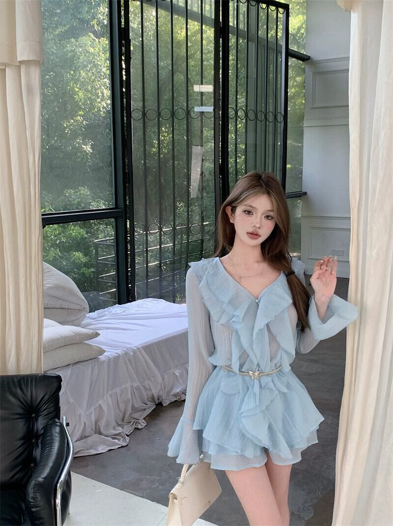 ティー系コーデ、甘辛シフォン長袖トップス、シャツ、春レディーススーツ、ショートパンツの2点セット ロング 大人ガーリー スウィート キュート カジュアル スプリング 春物 ショーツ ブルマー nana34669011602 | modepoisson