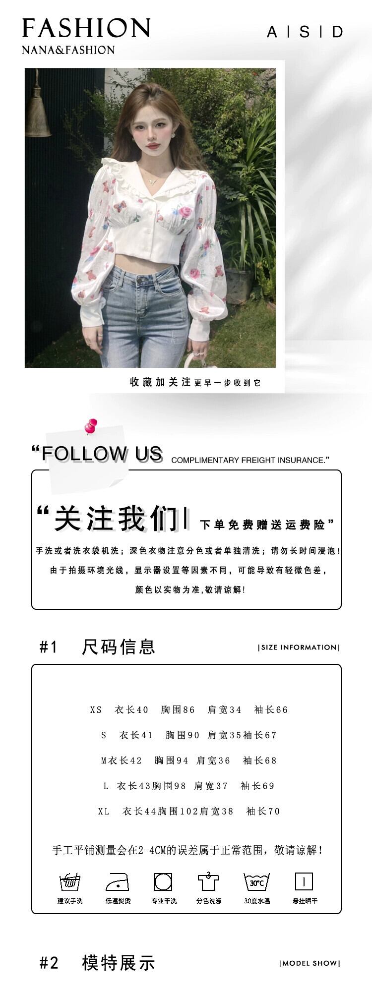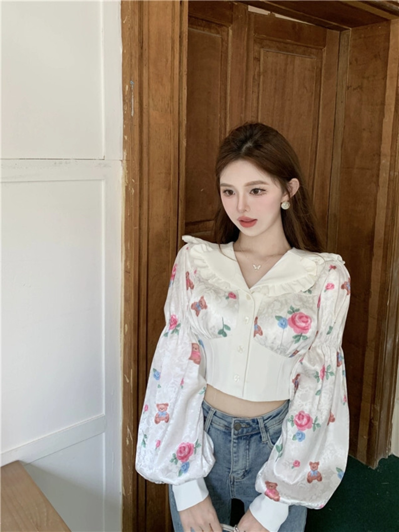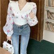 フレンチデザイン長袖シャツレディースニッチ甘い花柄ショートスタイルスリムフィットドールカラー新しいトップ ロング 大人ガーリー スウィート キュート カジュアル nana7795022071 | modepoisson