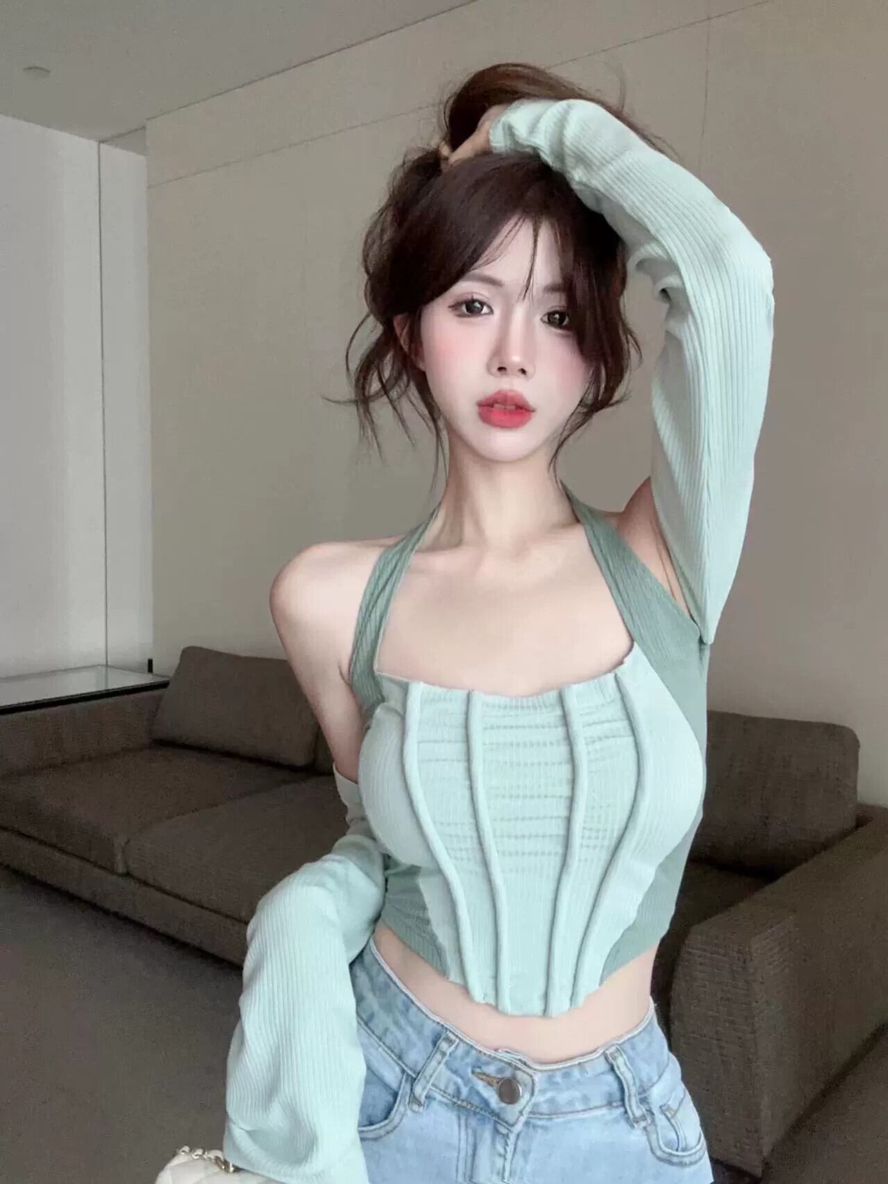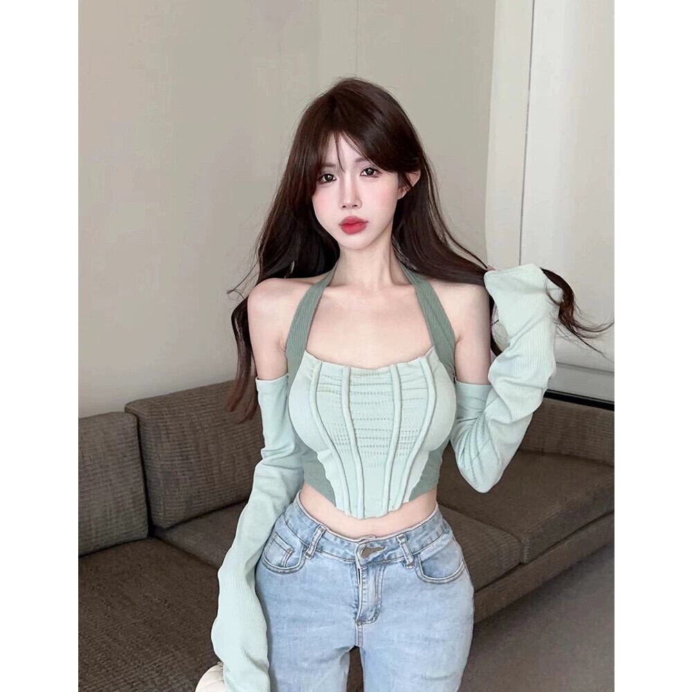 純粋な欲望ワンショルダーデザインスリムフィットオフショルダーホルターネックストラップスプライシング長袖ショートトップTシャツレディーススモールフレグランススタイル ロング nana78198959758 | modepoisson