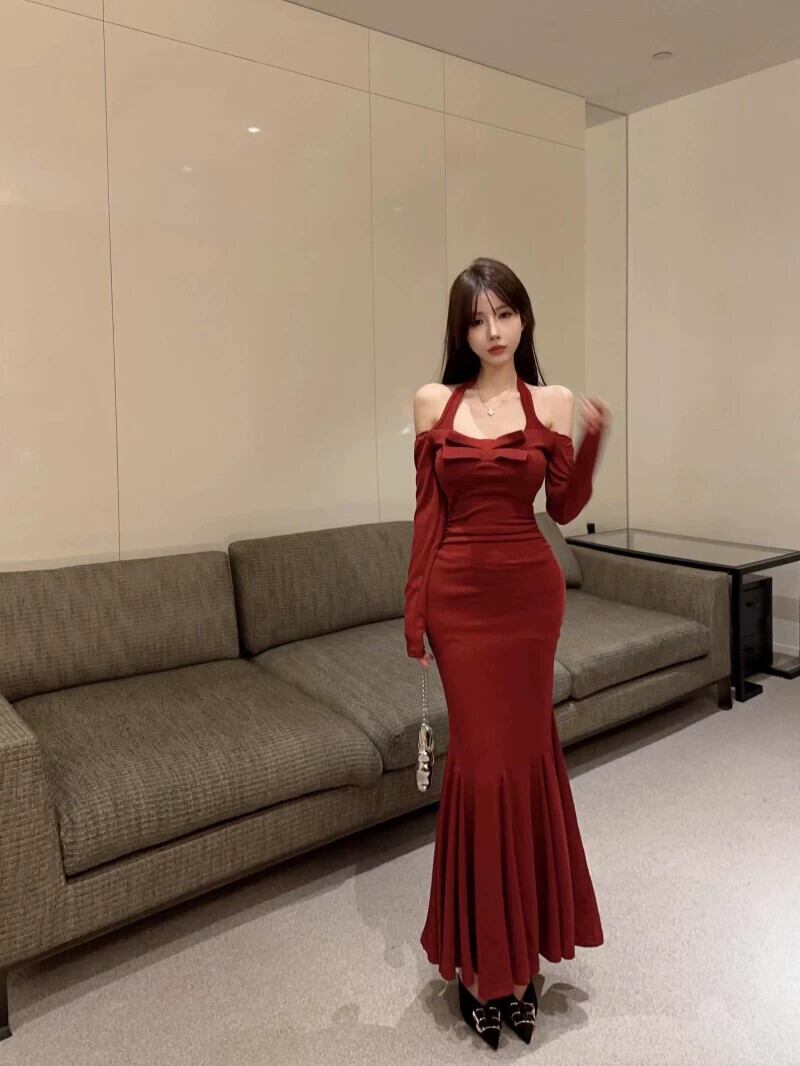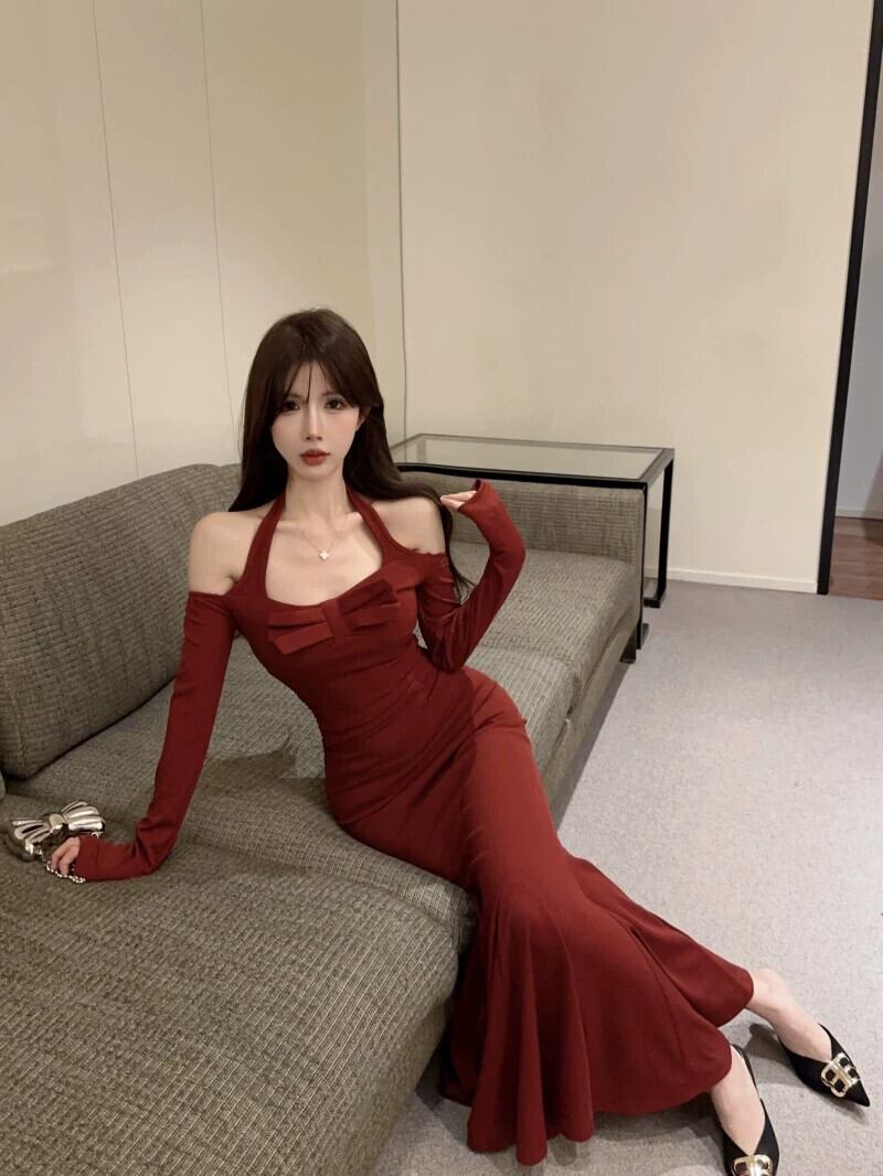 長袖ホルターネックサスペンダードレス女性、新しい春スタイルの高級ドレス、ロングスカート、赤いリボンフィッシュテールスカート レッド スプリング 春物 nana7341846274 | modepoisson