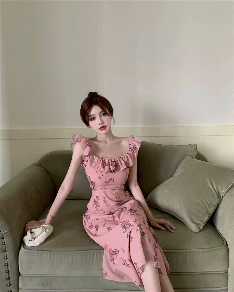 フレンチピンクスクエアネックドレス女性春の新ノースリーブ甘いウエスト痩身気質サスペンダー花柄スカート 大人ガーリー スウィート キュート カジュアル スプリング 春物 スクウェア nana58357181442 | modepoisson