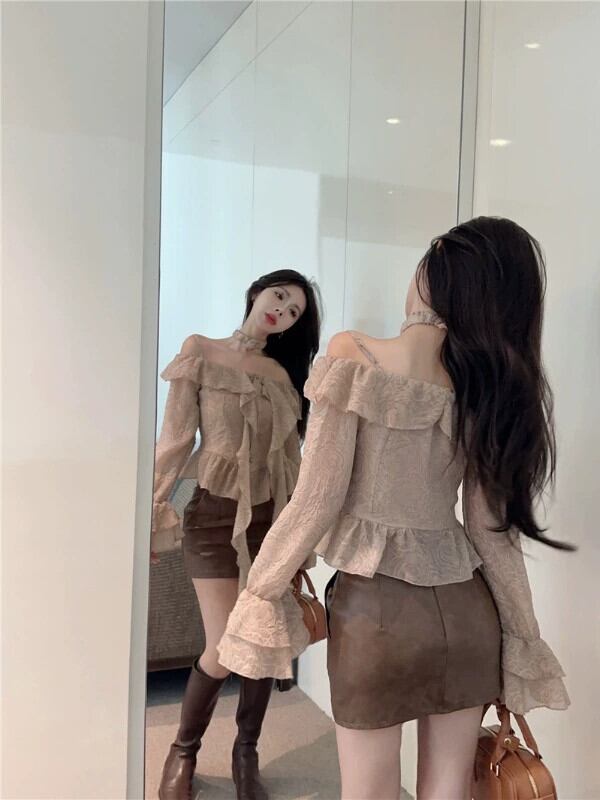 フレンチスイートスタイル重工業ローズジャカードテクスチャーフリルスリムシャツショートトップ女性 + フラワーチョーカー 大人ガーリー スウィート キュート カジュアル フラワーデザイン nana54319454469 | modepoisson