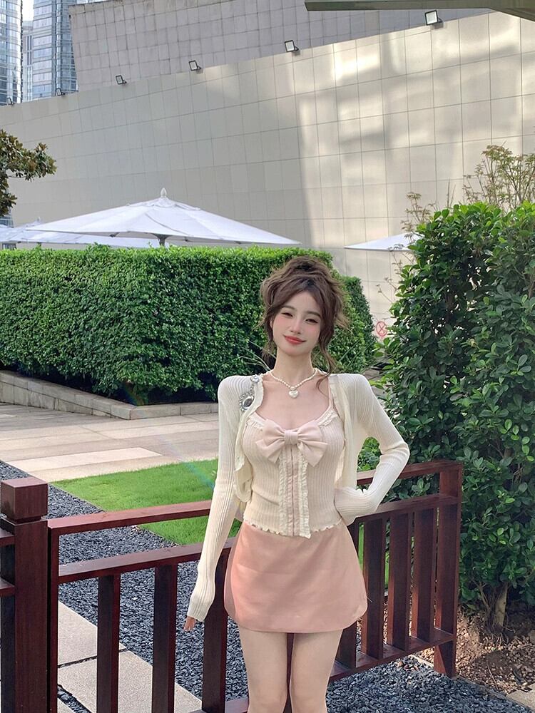 甘いスリムフィットのニットカーディガン、ニッチなチューブトップ、サテンの無地のAラインスカート、汎用性の高い婦人服 大人ガーリー スウィート キュート カジュアル ソリッドカラー nana25437337901 | modepoisson