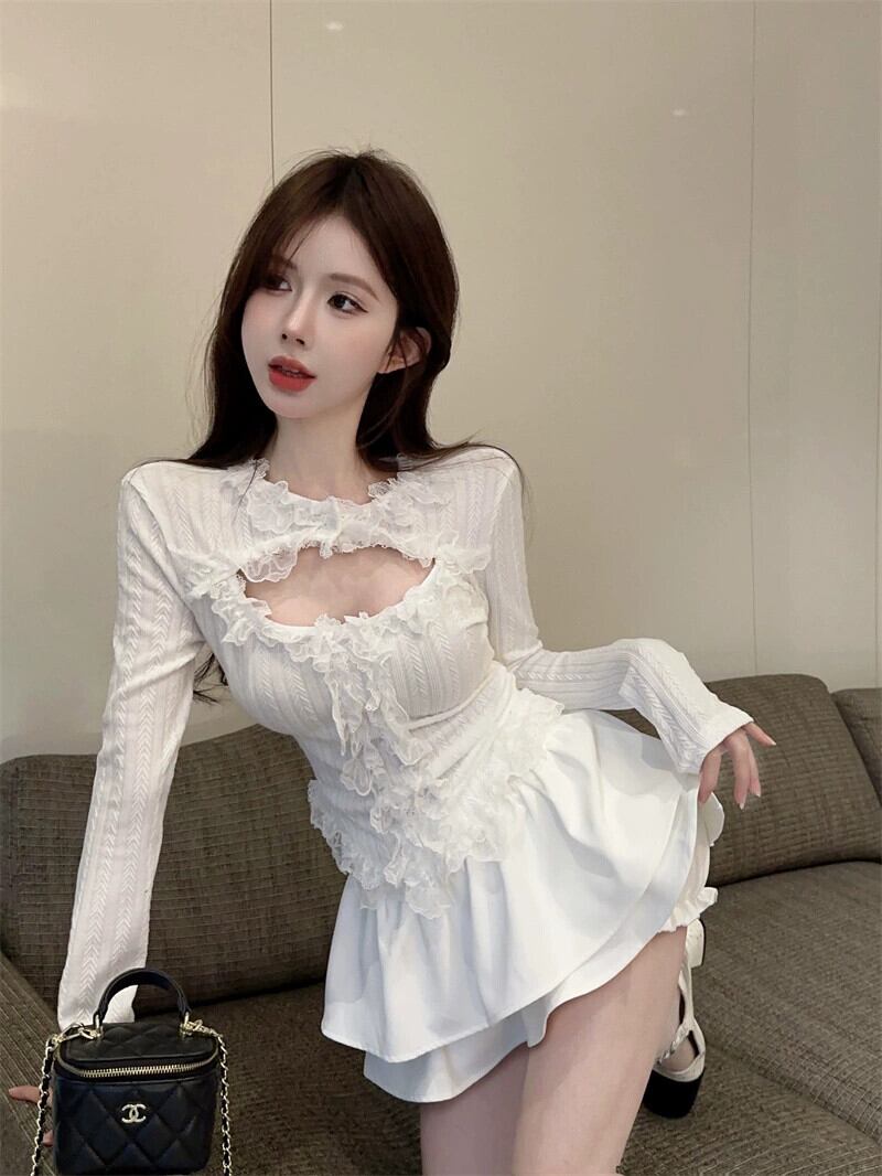 レーススプライシング長袖 Tシャツ女性の春夏 2024 新しいショートスタイル中空スリムスリムニッチ長袖トップ ロング スプリング 春物 サマー 夏物 nana96302594803 | modepoisson