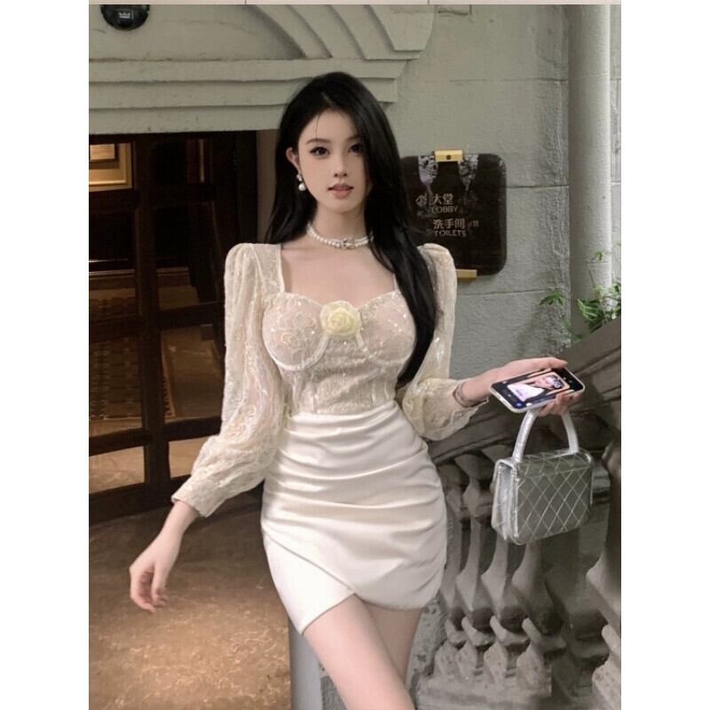 フレンチスクエアネックレースドレス女性秋痩身とエレガントな女性ヒップカバースカート新しい長袖ショートスカート ロング オータム 秋物 スクウェア nana96429197535 | modepoisson