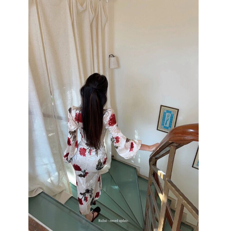 スクエアネック花柄長袖ドレスベルベットハイエンドフレンチスカートウエストバッグヒップフィッシュテールロングスカート女性秋と冬 オータム 秋物 ウィンター 冬物 スクウェア nana70264429732 | modepoisson