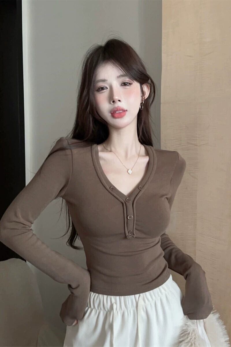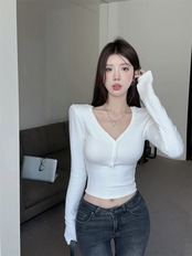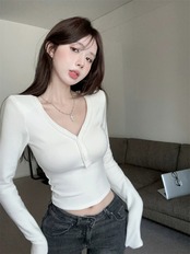 ボトミングシャツ アメリカン 右肩 長袖 Tシャツ 秋冬 Vネック 痩身ショート 甘いネクタイ ホワイト インナートップ レディース ロング 大人ガーリー スウィート キュート カジュアル オータム 秋物 ウィンター 冬物 nana79915647972 | modepoisson