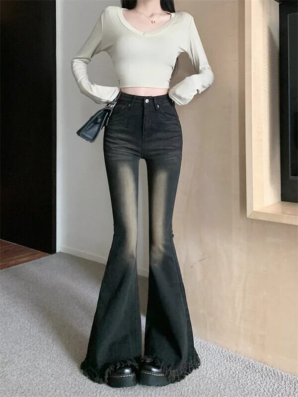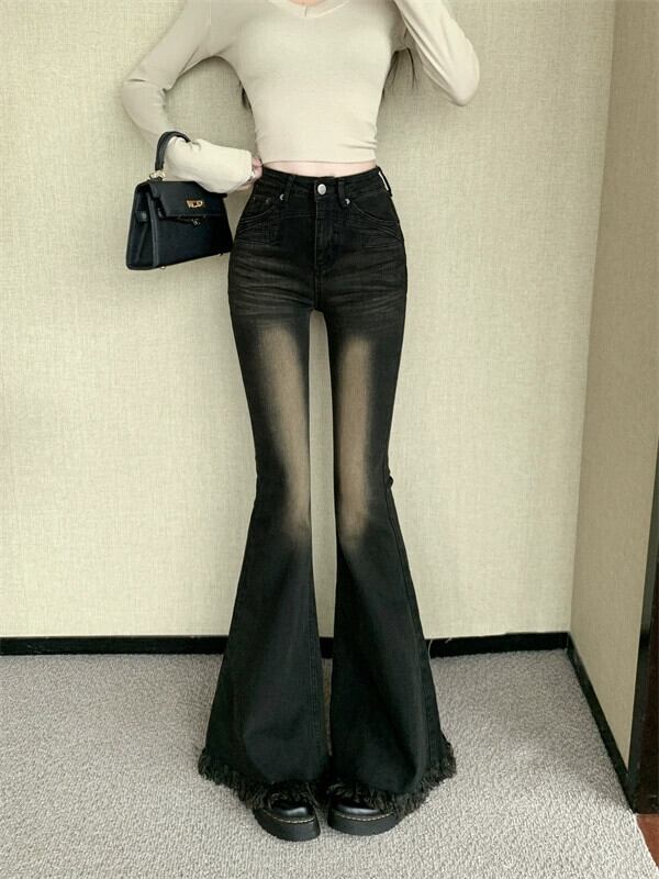 アメリカの新しいスタイルのウォッシュドレトロジーンズレディース、ストレートレッグ、タイトフィット、スリム、ハイウエスト、スリムフィット、マイクロフレアパンツ秋と冬 レッド オータム 秋物 ウィンター 冬物 nana66004377797 | modepoisson