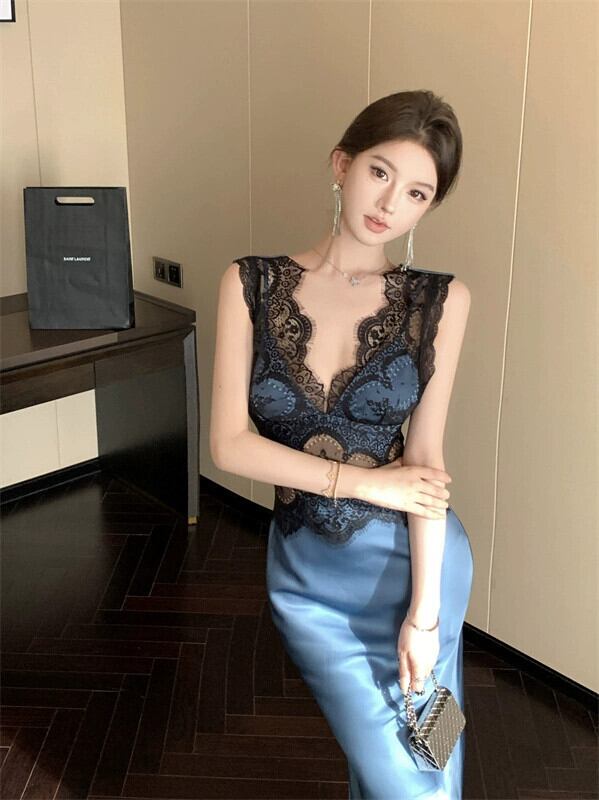 秋と冬のセクシーなヒップハグサスペンダードレス女性、ハイエンドでエレガントなブルーステッチレースVネックロングスカート オータム 秋物 ウィンター 冬物 nana44768930903 | modepoisson