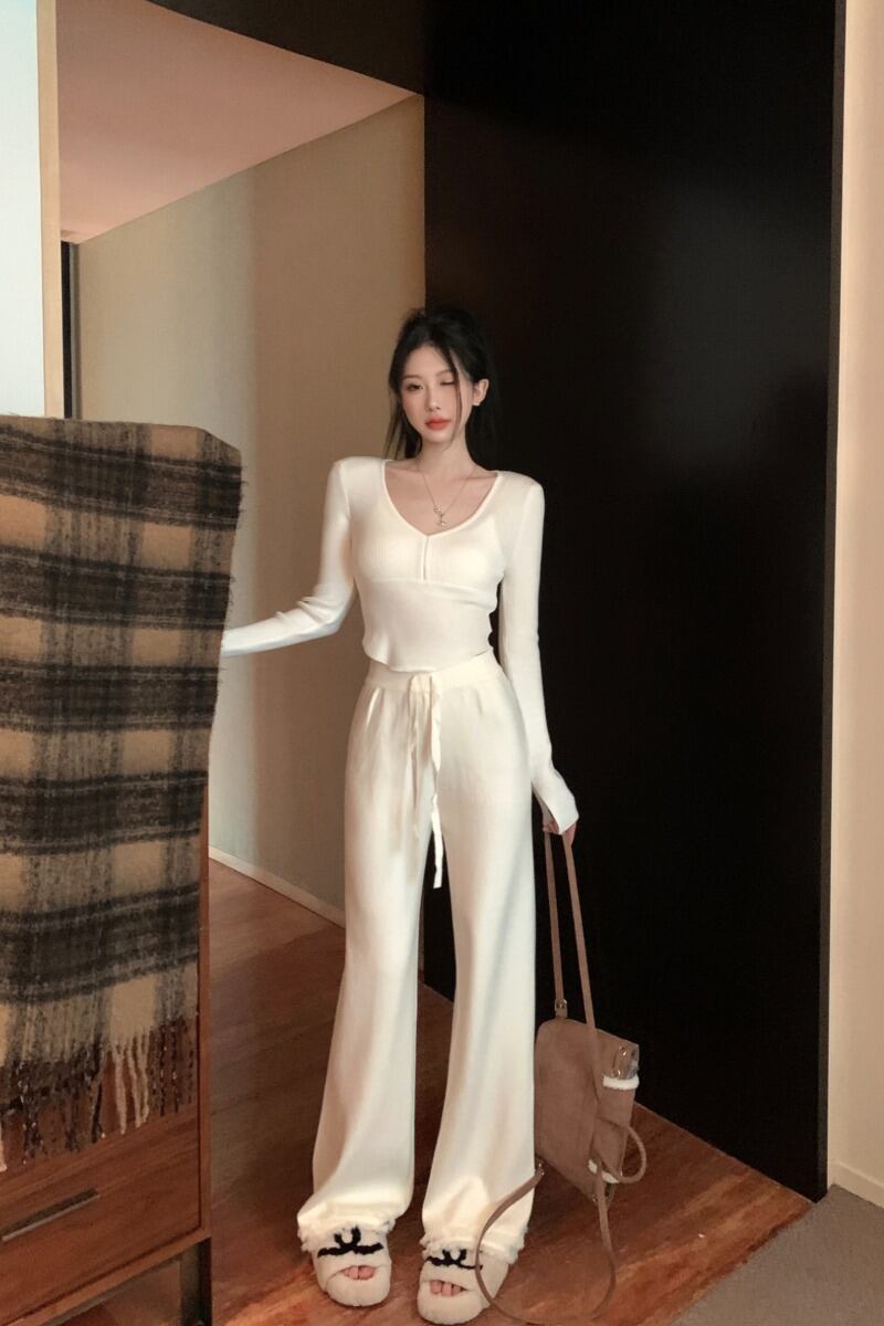 有能な女性のスーツ、純粋な色気のあるスタイル、半袖の長袖トップス、ハイウエストのニットワイドレッグパンツ、秋冬の甘辛2点セット ショート ロング 大人ガーリー スウィート キュート カジュアル オータム 秋物 ウィンター 冬物 ピュア nana78439657730 | modepoisson