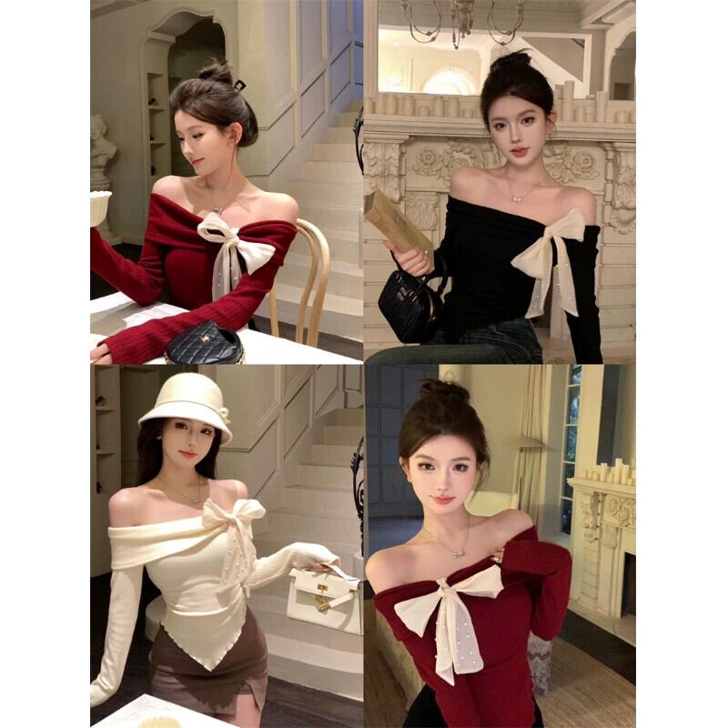 長袖 T シャツの女性の秋と冬の新しいワンショルダー リボン模造カシミア肥厚ボトム シャツ赤不規則なトップ ロング レッド オータム 秋物 ウィンター 冬物 Tシャツ nana2836723114 | modepoisson