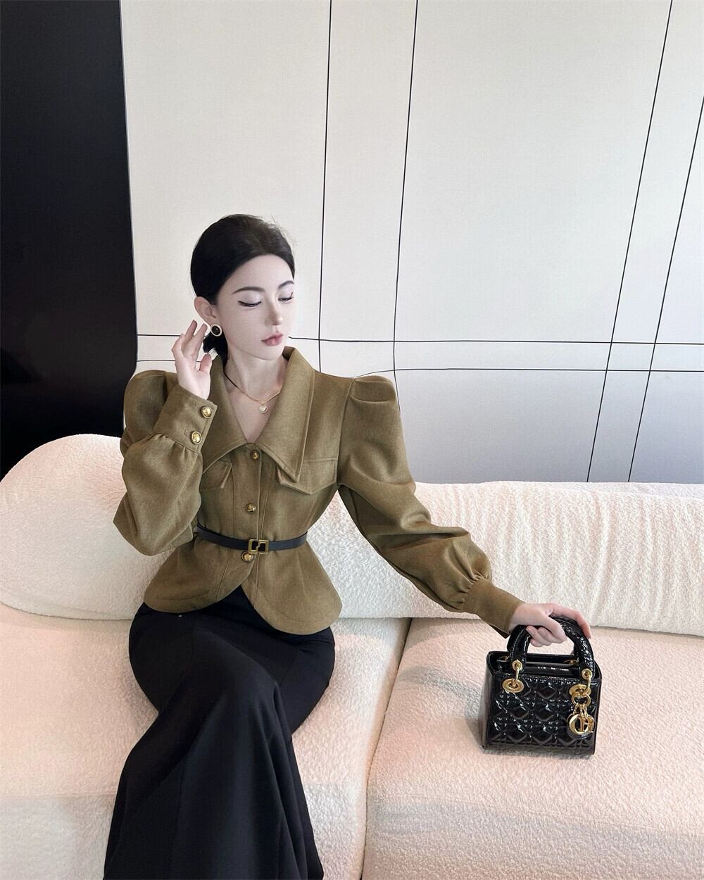 色:ベルト付きブラックジャケット,ベルト付きカーキコート,黒スカート