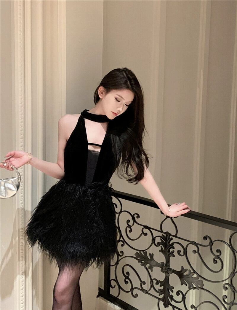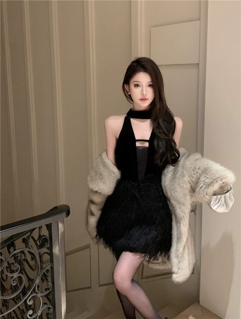 スプライシングメッシュ豪華なドレス黒の女性の 2023 秋と冬の新しいスタイルの小さなフランスの気質ドレスショートスカート ブラック オータム 秋物 ウィンター 冬物 nana42803099824 | modepoisson