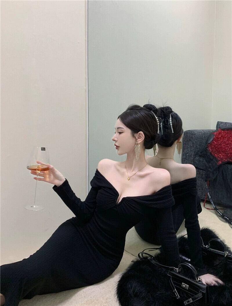 気質ドレスの女性の秋冬ウエスト痩身長袖 2023 新しいスカート黒のワンショルダーロングスカート ブラック オータム 秋物 ウィンター 冬物 nana86840781264 | modepoisson