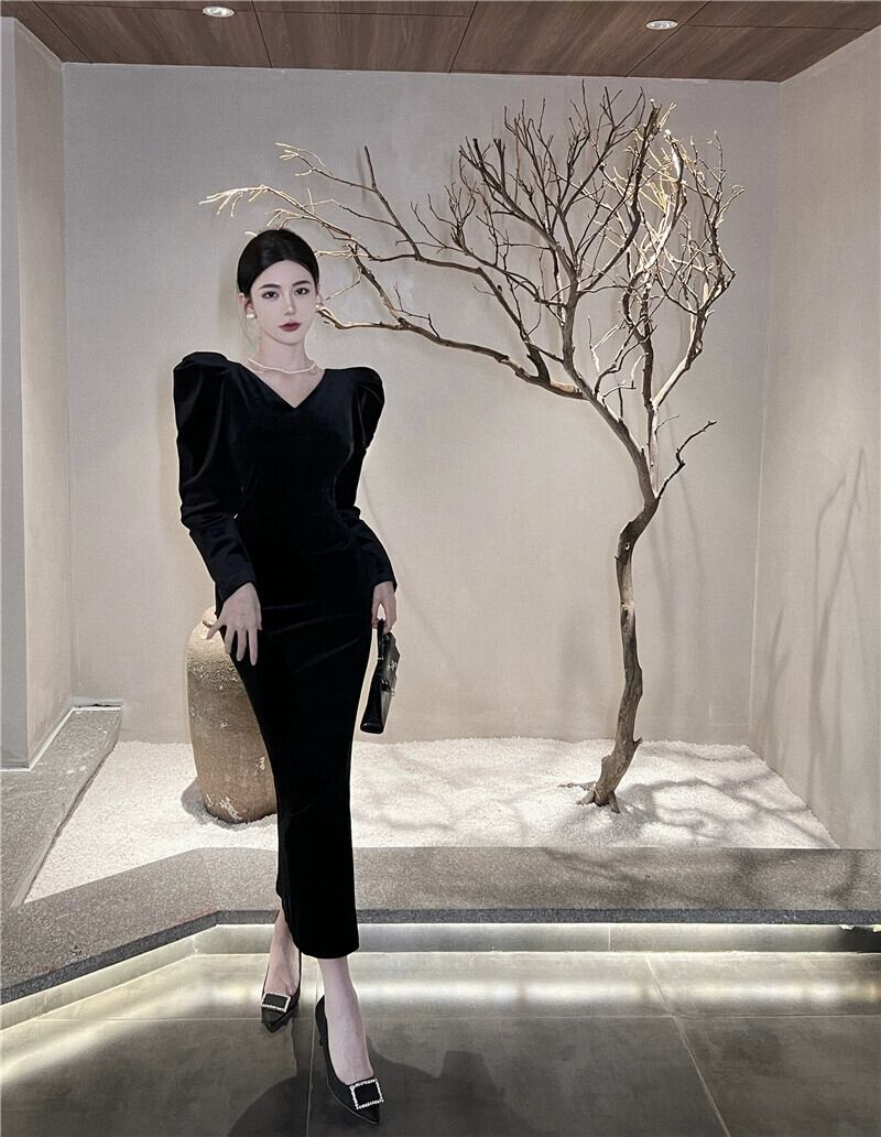 フランスのハイエンド V ネックベルベットドレス女性 2024 秋と冬の新しい気質社交家ヘップバーンスタイルのリトルブラックドレス オータム 秋物 ウィンター 冬物 Vネック nana33353271929 | modepoisson