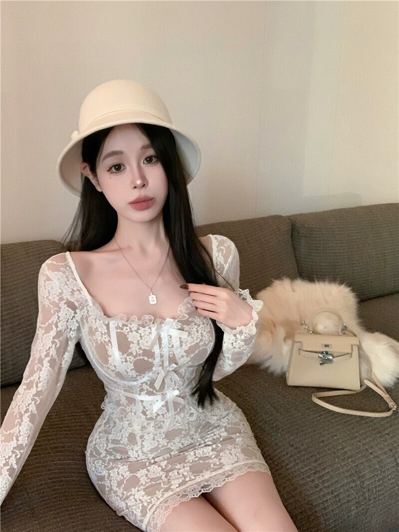 セクシーなレーススリムヒップ抱きスカート長袖ドレス女性の秋と冬の新しいスタイルのウエスト底リトルブラックドレス ロング オータム 秋物 ウィンター 冬物 nana33137488821 | modepoisson