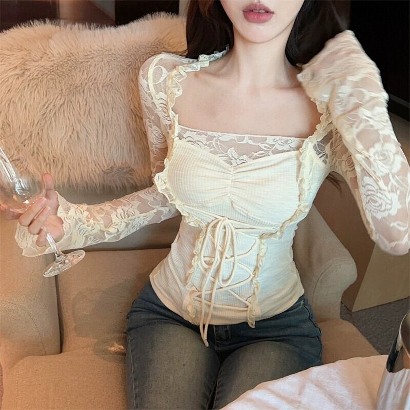 優しくて甘い、スリムフィットの秋冬のネクタイTシャツレディース、純粋な欲望のレース、セクシーなステッチ、ニッチな長袖ボトリングシャツトップ ロング 大人ガーリー スウィート キュート カジュアル オータム 秋物 ウィンター 冬物 ピュア nana5532928107 | modepoisson