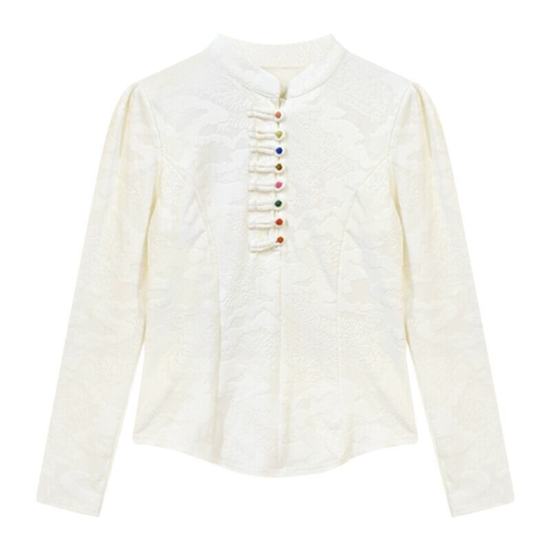 中国風長袖シャツジャカードカラープレートバックル中国風インナーレイヤリングシャツスリムフィットトップ女性の秋と冬の ロング オータム 秋物 ウィンター 冬物 nana67697903114 | modepoisson